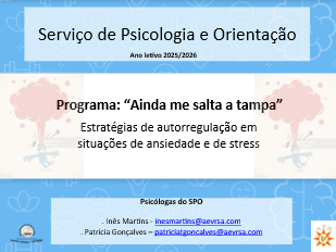 O SPO dinamiza o Programa “Ainda me salta a tampa”, que tem como objetivo principal promover a aquisição e adoção de estratégias de autorregulação e autocontrolo em situações de ansiedade e/ou stress. Atualmente, é desenvolvido no início de cada ano letivo com todas as turmas de 10.º ano.