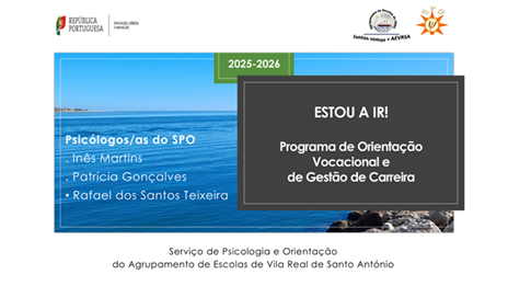 O Agrupamento de Escolas de Vila Real de Santo António disponibiliza aos alunos e alunas que se encontram a concluir ciclos de estudo (9.º e 12.º anos) o Programa de Orientação Vocacional e Gestão de Carreira – “Estou a ir!”. Este programa tem como principais objetivos fornecer informação, apoiar e orientar os/as estudantes no processo de tomada de decisão, ajudando-os a definir o seu percurso académico e profissional.