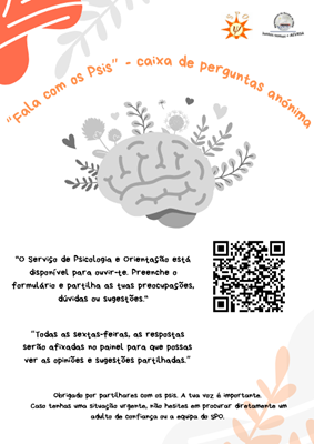 O SPO disponibiliza, para todos os alunos do ensino secundário, um QR Code que permite aceder à “Caixa de Perguntas Anónimas – Fala com os Psis”. Esta iniciativa tem como objetivo criar um canal acessível, seguro e confidencial onde os alunos possam partilhar dúvidas, preocupações ou sugestões, contribuindo para um ambiente escolar mais inclusivo, empático e emocionalmente saudável. Reforça, assim, o papel do SPO como espaço de escuta, prevenção e intervenção.